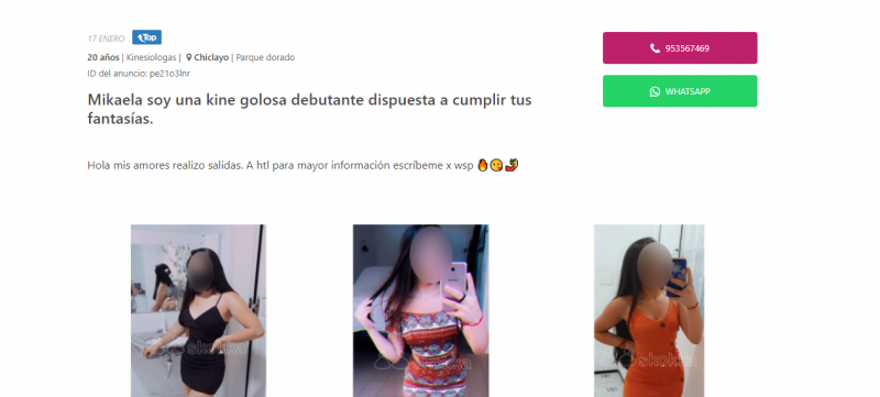 Si confirmo que es de Chiclayo, por varias razones: Por su forma de hablar cuando la tuve frente a frente, por los audios previos que me envió antes del encuentro que coincidieron con la voz de la que llegó, porque su amiga con la que me atendí semanas antes de dejarme su número me dijo que ella había venido porque la otra flaquita estaba en parciales de la universidad (acepté ese floro porque era una flaquita de unos 18 aprox), y porque cuando me atendí con la misma de las fotos (yo diría que se parece al 99.9% a la del anuncio y además llegó con la misma ropa del anuncio, no hay margen de error que sea otra) después que me atendí, mientras se cambiaba me confirmó que estaba en la universidad y que era de Chiclayo, y que supuestamente iba estar en el asunto por unos meses más y luego dejaría de publicar sus anuncios en skokka, pero me dijo que le escribiera a este número (901.....4) por si es que quería hacer uso de sus servicios; a si no viera sus anuncios en skokka.