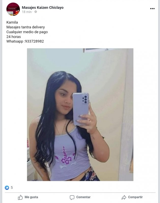 Es la chama la famosa Camila, tiene buen culo, yo la saqué en masajes es relojera y me pidió 200..:le di por el adicional 150 pero dms te relojea para 150 ...pero un día me atendí con laura en el policlínico, y nose cómo voy por el pasadizo y la veo ahí, me reconoció ..le hice el habla y pacte por 60 un polvo ...para los 30 de hotel más 110 de masaje más 150 son casi 300 soles ...y lo mismo q pague 60 soles ....y prácticamente lo mismo, yo tenía su contacto cuando bajaba a putear al policlínico pero lo perdi