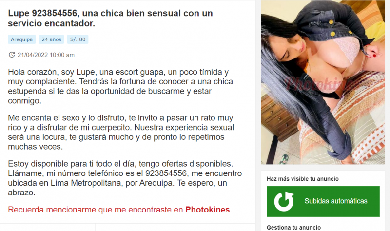 El aporte de una kine más se llama Elena me contacto por Wsap y viendo su número tienes avisos en Cybernenas, PK y otros, bueno este es mi apreciación aquí el ranking.