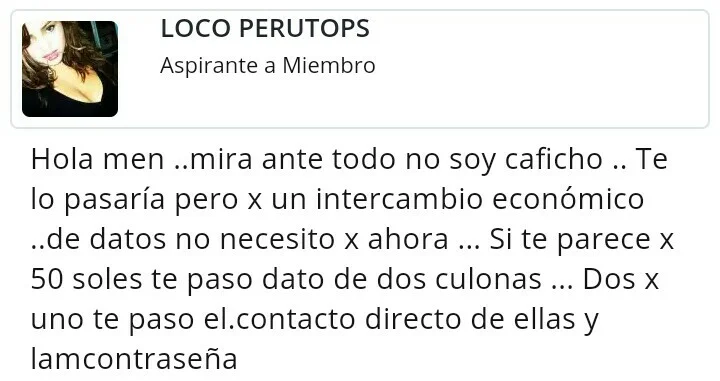 que bueno que este tipo de lacras este fuera del foro, estemos alertas, nunca faltan estos personajes pidiendo dinero, cuando el espíritu de este tema era solo compartir e intercambiar muy discretamente algun dato de alguna flaca caleta, asi se desvirtua el tema.Cofrades