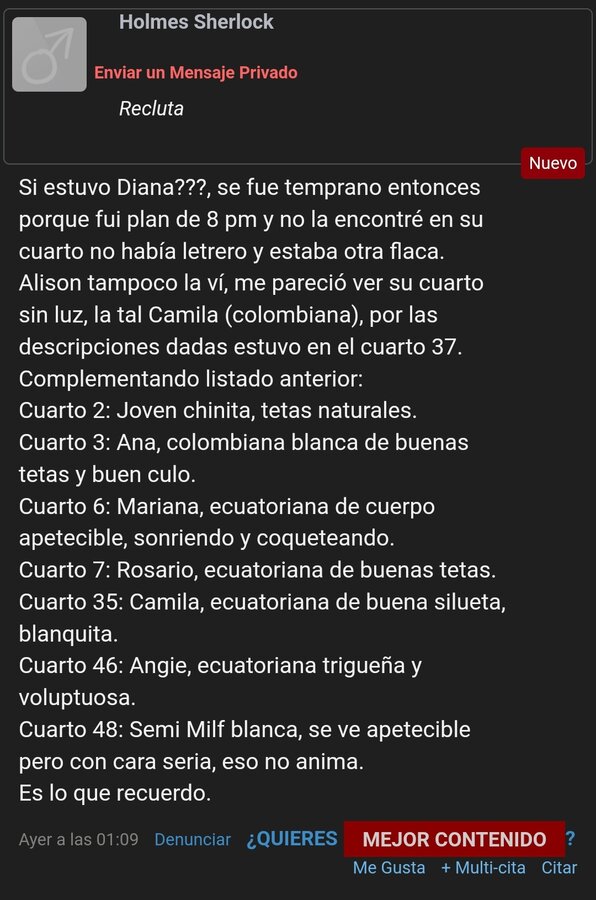 Cofra @Holmes Sherlock, creo que si me equivoque con lo de Diana, no lo borre de mi listado anterior, porque no recuerdo bien si vi su cartel, Alison si estaba cofra, a ella si la vi parada afuera de su cuarto. No cofra, a la tal Camila colombiana, me la comí el sábado en el 14 y ahí mismo estuvo hoy, la del 37 habra sido otra. La semi milf blanca del 48 es Catalina, es colombiana, quizás afuera estaba seria, pero me la comí y da buen trato como toda colocha. Es lo que recuerdo de las kines vistas, ya que llegue un poco tarde y varias estaban ocupadas o quizás no habían venido como menciono.