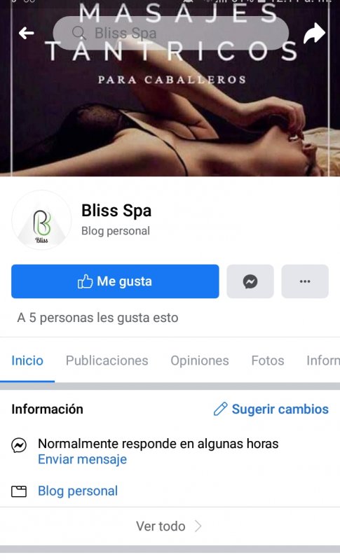 Me acaba de agregar al Instagram este spa, bliss spa, y pues hable y me dió.un número de wsp, pedí información x allí, dan masajes con jalada de tripa a 100soles, le pregunté si hacía servició y me dijo k no, k solo estimulación manual pero si el masaje lo daba desnuda. No es el mismo que atendía x San Isidro, allí atendía rubí la tetona... Bueno no me animo x este servicio, me mandó una foto donde se ve que es boluptuosa la masajista, sale dando masajes a un patita.. si se animan allí colocan el rating, yo next.. bliss spa está en Instagram