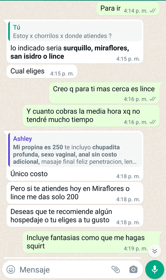Jaajjajajaja como me vacilo con esta perra, ahora se ve que con tanta competencia extranjera, se ve q la esta viendo verde pero no de dolares, si no q no ahi clientela xq la escribi a su wasap y me dice que su propina es 250 soles mas detalles en las imagenws q subiré, y le pregunto q solo media hora q no tendré mucho tiempo, y me dice q es su única tarifa pero si queria le pagara solo 200 soles q pendeja la deje en visto xq de ahi alas 6 de la tarde q quede le iba a mandar mensajes como no le avise nada ella me mando un mensaje que como me iba q jajajajja la deje en visto x perra.