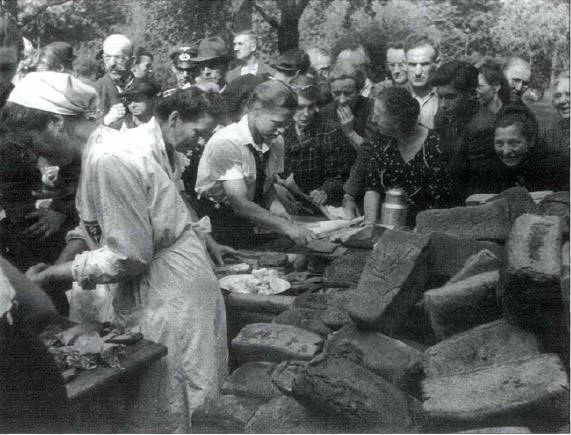 Gulaschkanone o, como se le conoce oficialmente, el Feldkuche (visto en el fondo). La cocina de campaña era tirada por caballos y consistía en una olla grande en la que eran echados los ingredientes. La cocina sirvia guisos calientes (de ahí el nombre de Gulasch cañón). El pan era suministrado por las panaderías de regimiento que estaban centralizadas.