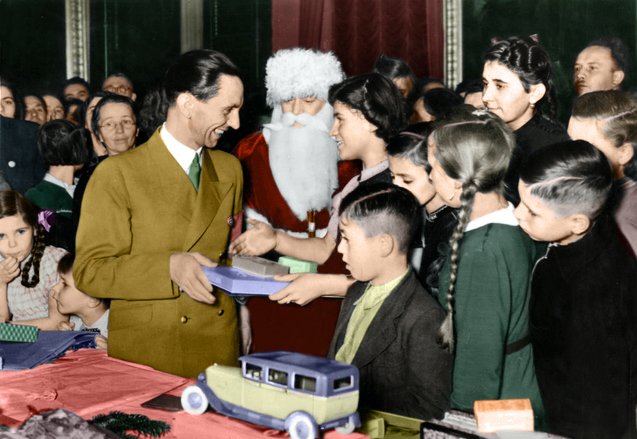 extraña foto navideña Joseph Goebbels , Rodolfo Hess y Hitler disfurantando las navidad de 1939