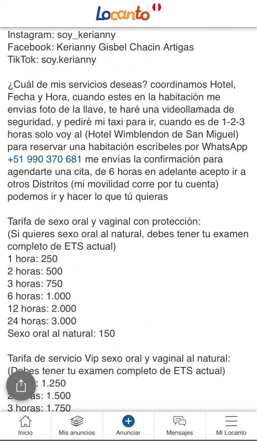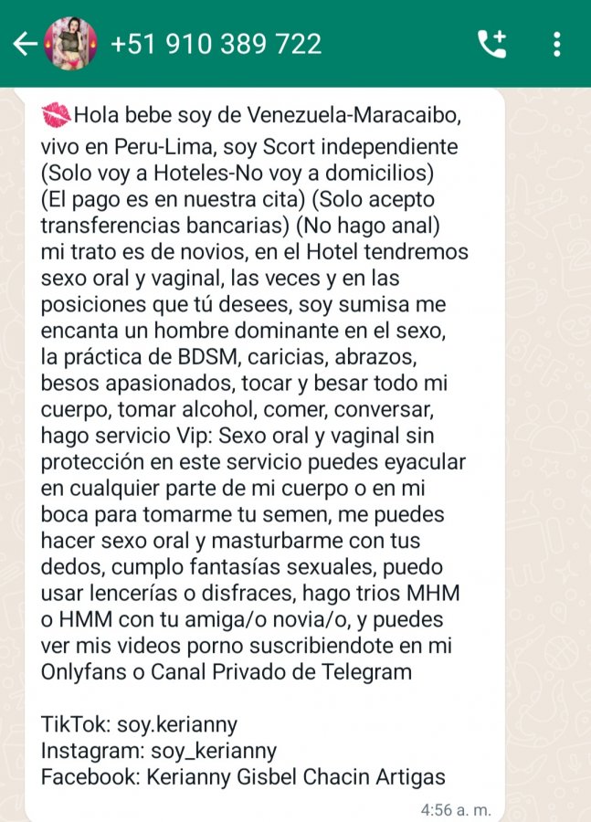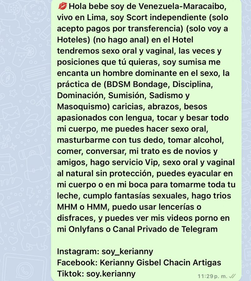 Yo sé que aveces la calentura puede jugarnos en contra pero si ves esa kine (en este caso kerianny) y ves que ofrece servicio vip y lo quieres hacer a pelo podrías hacer los sgtes pasos (sería lo ideal)Lo está anunciando también en Locanto deben colarle la advertencia de conductas de riesgo