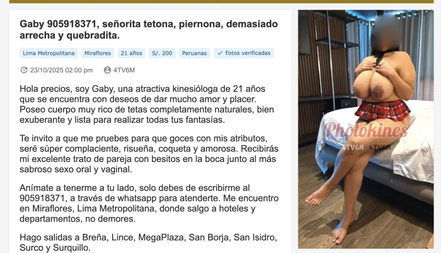 creo que estuvo hasta agosto junto con Paola en San Borja, me cité con ambas, solo que aún no pude dejar el review y ranking detallado, pero JADE ya no anuncia ni ya no está, ella siempre se retiraba temprano y esta una corta temporada de unos meses en Lima y luego desaparece, como había posteado en mi ranking de Jade de hace meses, Jade no tiene un servicio tan implicado ni tampoco lo vive, no me dejó que le mamara las tetas a gusto, cobra adicional por todo y durante el oral usa un pañito para no chocar con la piel del pubis y no mojar con la poca saliva y ese no es el trato que yo estoy buscando en un oral o de una atención, por el resto si me trato bien, conversadora, hace todo lo pactado eso si, pero no lo disfruta para nada ni siquiera en anal...