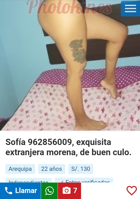 Bueno hace una semana estuve por la ciudad de Ica de pasada pues regresaba de viaje a Arequipa de Lima y bueno me hospede por un hotel cerca a la plaza de armas de esa ciudad (Ica), ya eran como las 8pm creo y salí a cenar a una pollería en plena plaza y me gane el pase con las chamas, buenas chamas buenas eh de esas que te hacen voltear el cuello en la calle. tienen la misma modalidad que en Lima las chamas que están por el Mall del sur. en la plaza ellas van caminando por las calles colindantes a la plaza y bueno me anime a hablarle a una de ellas, estaba nervioso pues tenia miedo a que me mande a la ****** pero dije "estoy en ciudad ajena y nadie me conoce, a la ******" le hable y la chama me dijo que si y la lleve al hotel le pague y procedimos al mate, debo reconocer que me gano los nervios y el primer mate no la pase bien pes el muchacho esta nervioso también XD bueno la chama me dijo que por 50 so hace adicional como oral sin pre, entonces accedí pues quería que el segundo mate sea bueno, en conclusión si están por esa ciudad y ven chamitas ricas caminando cerca a la plaza son putas. la chama me dijo que anunciaba en photoestafas y que tenia pensado visitar Arequipa en un par de semanas aquí les dejo el link por si la ven en los anuncios de Arequipa. la flaca se comporta bien y es un poco gruesita pero no me quejo. Saludos