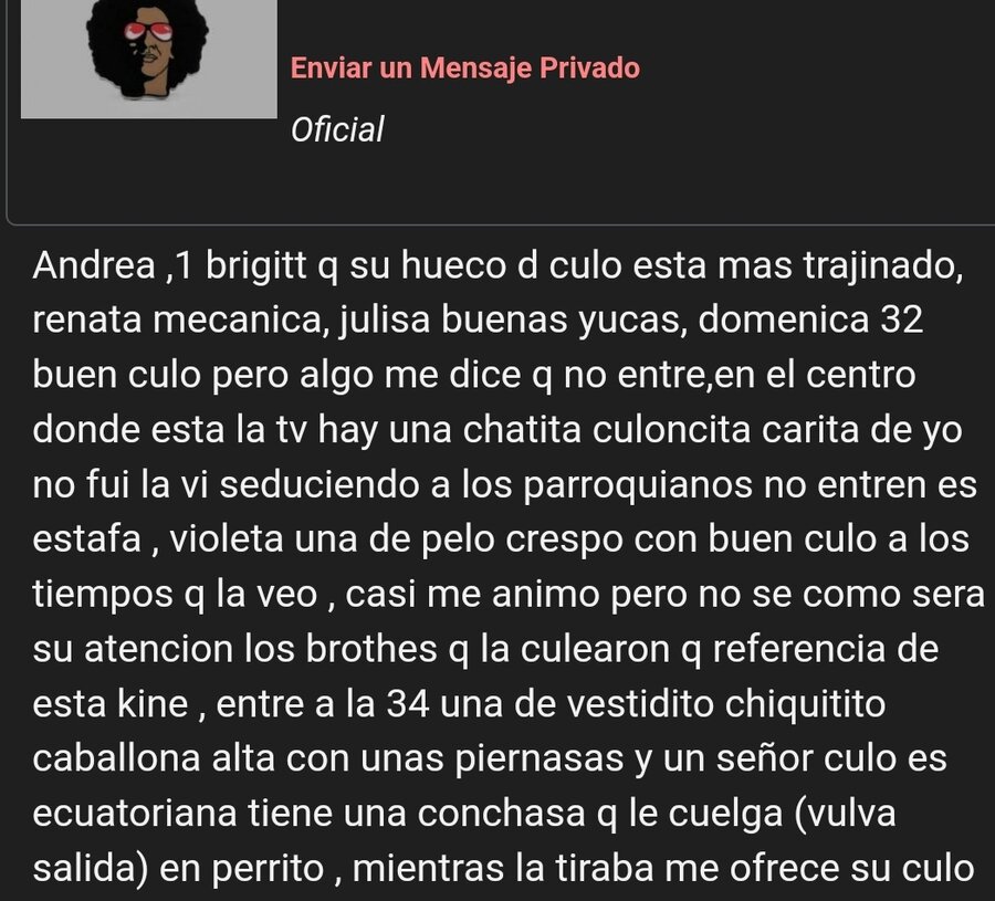 Posdata : Ese viejecito es medio achibolado en vez de reírse dice XD, XD y en vez de afirmar alguna idea dice Cintura o caderas XD, confirma te esa muchacho,o algún cofra más del grupo que esa ecuatoriana cuando está de buen humor te da su ano o vagina peluda sin condominio