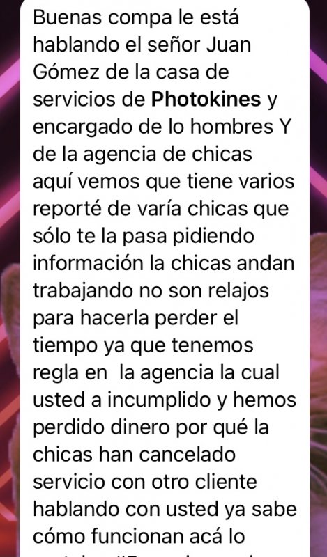 Gente por enviarle un mensaje hace días a una kine en photokine para pedir información , se me envió un mensaje amanezante a mi número, vaya cagada, ni pase con alguna kine, mejor dejen de usar esa página photokines