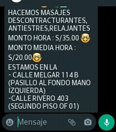 vi comentarios al respecto unos decían que si era de la nota y otros que los mandaron a volar, por el número en la puerta di a un Facebook de la cuenta de los masajes, era obvio que son de la nota, alegre fui y resulta que atiende la misma tía que estuvo bastante tiempo en el semisótano ( o su hermana gemela), suelta el menú con un poco de insistencia, no lo da de arranque, no pasa nada que fui corriendo, está en el primer piso….en el segundo piso hay otro local pero estaba apurado y no vi por donde subir, las puertas estaban con llave hacia ese piso….