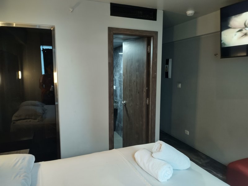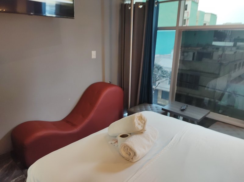 Características Hab: Habitación moderna, me toco habitación, que parecia una ratonera por no decir caja de fosforo. Se sube por ascensor y se ingresa a la habitación y enciende con la tarjeta que te dan en recepción, hay veladores pequeñas, tele con YouTube, sillón tántrico, hay un frigobar, no habia ninguna bebida, también hay una caja fuerte, la habitacion cuenta con aspersor contra incendio y extractor de aire, aire acondicionado, lo malo olia a cigarro, no se si el aspersor contra incendios, se activase con solo fumarse unos cigarros o porros, la habitación en si es pequeña y no se podia mover mucho el sillon tantrico. Pedi habitacion a la ventana que si es amplia, en resumen la habitación cumple para solo ir y cachar, me hiso recordar a las habitaciones del telo vecino Aristo.