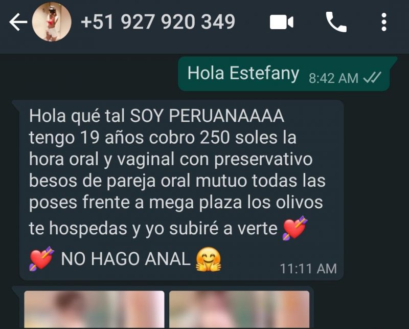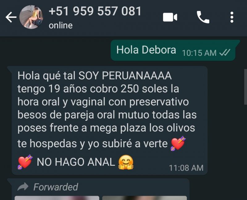 Me he dado cuenta que parece que esta chica sea de agencia, tiene mensajes predeterminados parecidas a al menos otras 2 chicas, las 3 me respondieron al mismo tiempo, las 3 tienen "19 años", las 3 son peruanas y las 3 cobran lo mismo: