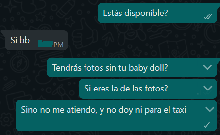 Buenas noches cofras, el siguiente molesto incidente ocurrió la semana pasada. Pero antes pongo en contexto, días atrás, me salí con la mía al encontrar una Kine en PK, que era la misma del anuncio, en unos momentos subiré un ranking, además de dar unas vueltas en mi Jepeeta(carro) y ver dentro de un taxi a unas Kines con su fercho, muy guapa una de ellas ya que estaba sin mascarilla dentro de dicho taxi. Pero justamente se parecía mucho a la foto de perfil del WhatsApp que anunciaba en PK del cual me hicieron el cambiazo. Ello acumulado a mi suerte de encontrar una verdadera, fue la razón por la que tomé la decisión de atenderme y confiarme con la chica del sgt. número 941 974 141.