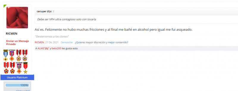 Justamente porque es un foro de cofras la idea es que la información sea confiable. Si se afirma algo: "una tremenda verruga en el vientre que me aseguré de verla y analizarla bien." no vale echarse para atrás luego diciendo "es mi opinión". Es una verruga o no lo es, hay una ETS o no la hay. Lo dejo ahí, saludos.
