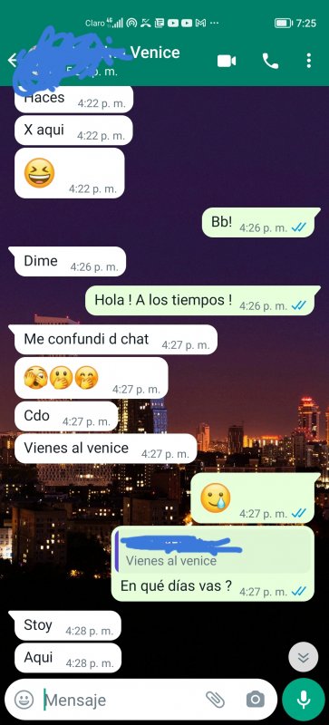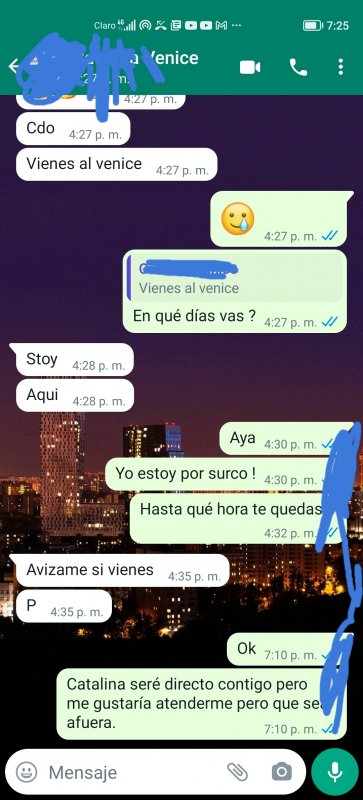 De antemano hablando de novios, mantenidos y peor aún los cachudos, pues es MUY LAMENTABLE que en venice spa la mayoría (99.8%) se hayan vuelto eticosas y relojeras y sin perjuicio a ello las que empezaron como nuevas en estos lares y con el pie derecho, pues resulta que poco a poco se han vuelto indiferentes con el cliente, por ejemplo : cuando un cofra pregunta con el respeto debido si la atención pueda ser afuera, pues ellas optan por dejarte en visto, y humildemente en mi opinion no debería ser así.