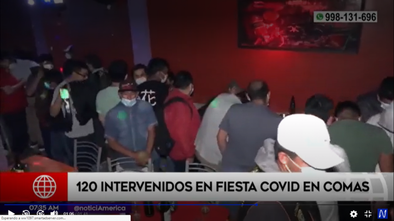 Más de 120 personas fueron intervenidas en una fiesta COVID-19 en Comas. El local tenía por fuera apariencia de una residencia, pero funcionaba como un prostíbulo clandestino en pleno estado de emergencia.
