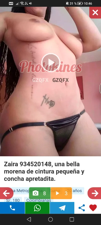 Sobre Zaira, se que la pasada estaba ausente y la recepcionista me ha confirmado que desde este lunes 19 regresaba, lo que he verificado en su anuncio pk desde ayer y hoy en que publica video, lo que confirma que si está atendiendo, te adjunto foto del video publicado en estos momentos en su anuncio